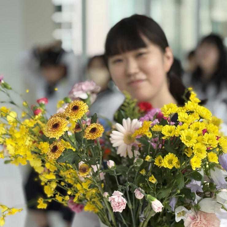 今日、お花の日礼拝を行いました。花はとてもきれいでした。終礼に、花束を作って、病院、交番、などのところに届きに行きました。